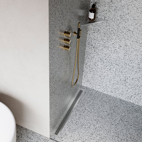 Alle vores sommerhuse har som standard Unidrains elegante Classic line linjeafløb i brusekabinen, ønsker du flere lækkerier, tilbyder de også knager, toiletbørster og sæbehylde, som tilvalg.